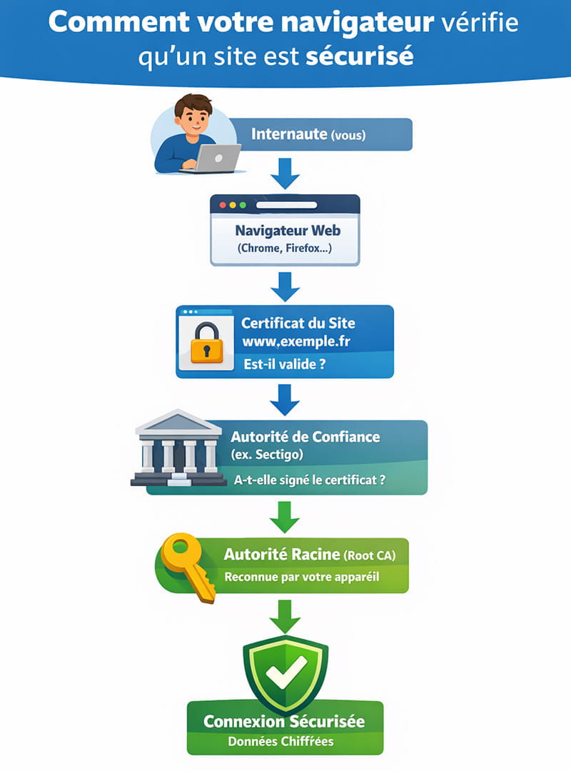 - Il vérifie que le certificat a été signé par une autorité de confiance, comme Sectigo.