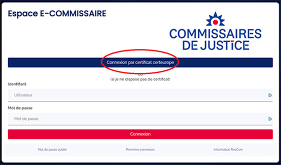 Vous devez vous connecter à votre espace dédié sur le portail professionnel en utilisant votre certificat CertEurope : www.e-commissaire.org