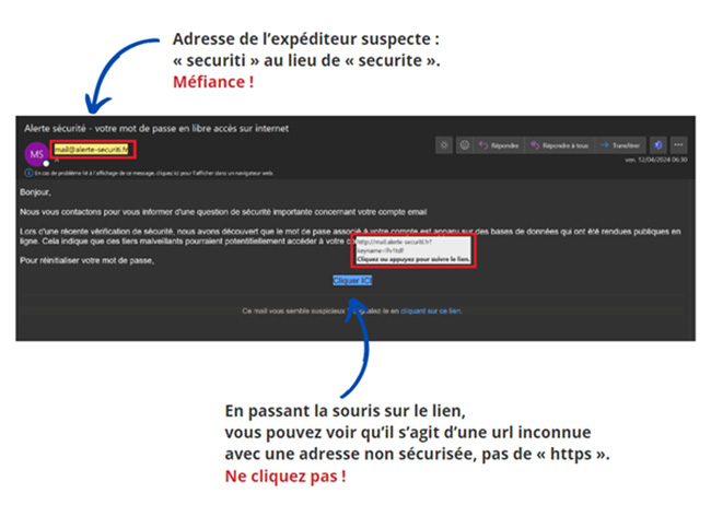 La majorité d'entre vous a su résister à la tentation de cliquer, démontrant ainsi une vigilance appréciable face aux risques numériques. Cette précaution peut en partie être attribuée à l'envoi, la veille, du premier Info Cyber sur les rançongiciels et l'hameçonnage. Ce bulletin présentait les bonnes pratiques et les réflexes à adopter en cas d'attaque, contribuant ainsi à renforcer votre vigilance à l'égard de cet e-mail suspect.